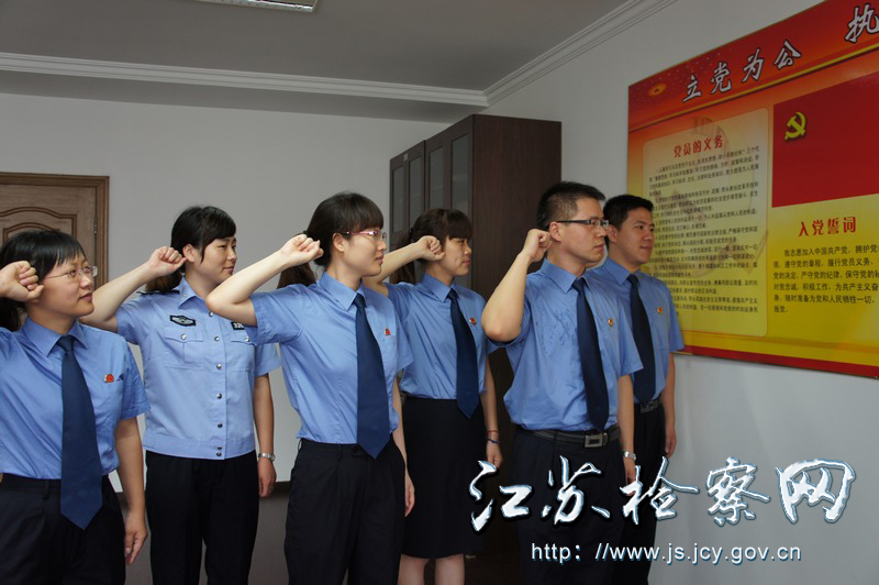 沈鹏飞(右二)和同事们在“七一”时重温入党誓词,将“履行党员义务,对党忠诚,积极工作”铭记在心。