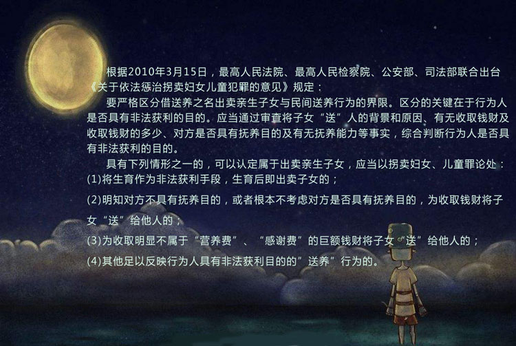 根据2010年3月15日,最高人民法院、最高人民丝袜小说 、公安部、司法部联合出台《关于依法惩治拐卖妇女儿童犯罪的意见》规定:不是出于非法获利目的,而是迫于生活困难,或者受重男轻女思想影响,私自将没有独立生活能力的子女送给他人抚养,包括收取少量“营养费”、“感谢费”的,属于民间送养行为,不能以拐卖妇女、儿童罪论处。对私自送养导致子女身心健康受到严重损害,或者具有其他恶劣情节,符合遗弃罪特征的,可以遗弃罪论处;情节显著轻微危害不大的,可由公安机关依法予以行政处罚。