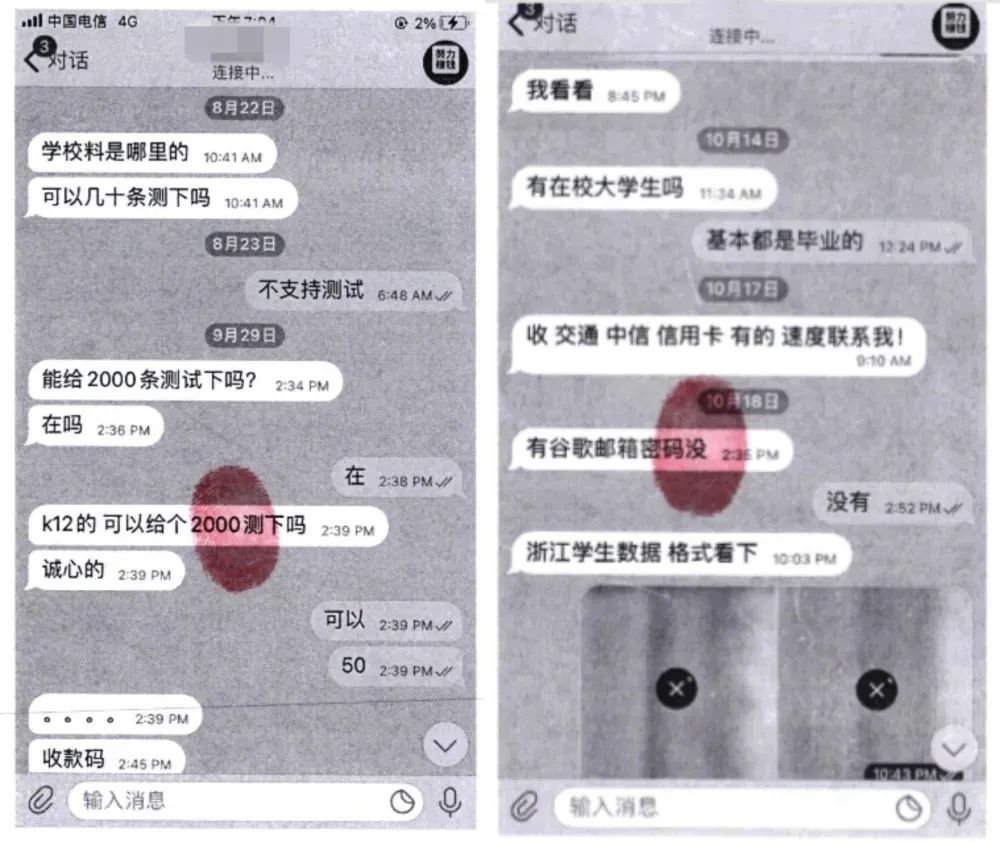曹艳晓:根据警方调查发现,犯罪嫌疑人张某在Telegram软件上用比特币购买了大量个人信息,建立起包含学生信息、房主信息、母婴数据、保健品数据等各类数据的“数据库”,并在QQ群、微信群等发布广告,加价兜售公民个人信息。一旦有人联系张某,他就会先给对方发送几百条个人信息,用于测试数据的真实性,之后再进行大批量的数据交易。
