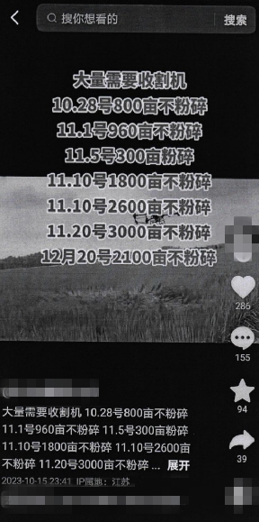 高翔:他工作时会同步拍摄一些农田视频,将农田视频配上“900亩1200亩20000亩待收割”的文字,发布在微信朋友圈、抖音上,并声称自己认识很多种田大户,有大量成熟的稻田等待收割。王某以中介身份与收割机手洽谈收割价格、收割需求等,并约定中介费用,双方达成一致后,王某就以接单定金名义收取钱款,并约定具体收割时间。