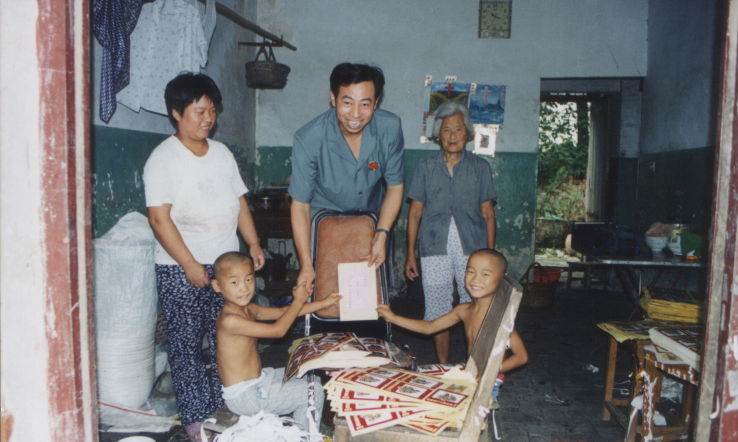 照片上,简陋杂乱的家里,两个只穿着小裤衩、瘦骨嶙峋的幼小男童,正在撕剥着不干胶瓶贴,有轻度智障的母亲和年迈的奶奶在一边照看着兄弟俩。检察官把扶贫款递过去时,兄弟俩伸出了小手,脸上露出了真诚的笑容。