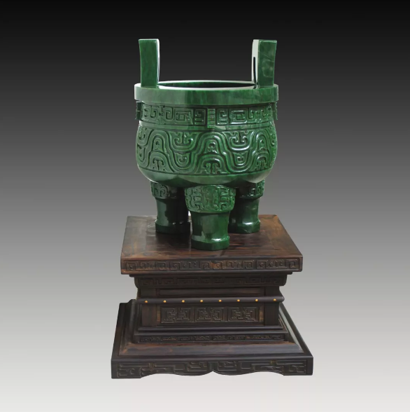 此后,他陆续创作了大大小小数十件玉鼎。2008年,他又用1.5吨的优质加拿大碧玉,创作了一件净高80厘米、宽60厘米的大型碧玉《宝鼎》。此作品的型制更加雄浑厚重,线条更加洗练流畅,雕工更加细致圆润。该作品一经问世即屡获殊荣。
