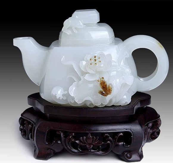 他将“减法”引入创作,尽量少用工艺堆砌,代之以写意的中国画手法,使作品风格更为简洁、明快、流畅。比如《荷塘清趣》白玉茶壶,只在壶体四分之一的面积上雕刻了一朵白荷和一只青蛙。素颜的表达方式,非但没有减损茶壶的美感,反而让白玉的莹润展现无遗。