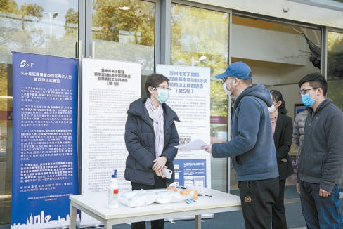 2月10日公司复工,戴雅萍(左一)现场检查人员登记和防疫物品发放情况。
