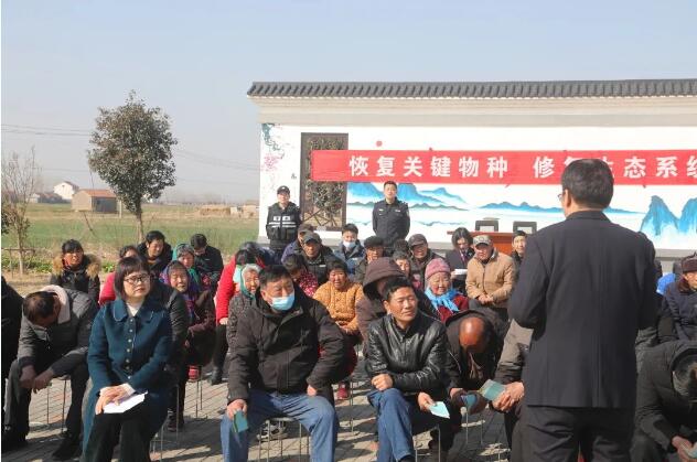 在江苏省灌云县下车镇德兴村村委会广场上,坐满了当地村民。广场四周悬挂的保护野生动物公告和条幅鲜明醒目。