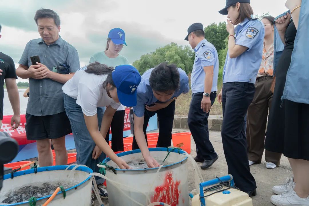 “提起桶来,三,二,一,倾倒——”话音刚落,2000余尾鱼苗争相跃入长江,为长江增添了一份生机和活力。