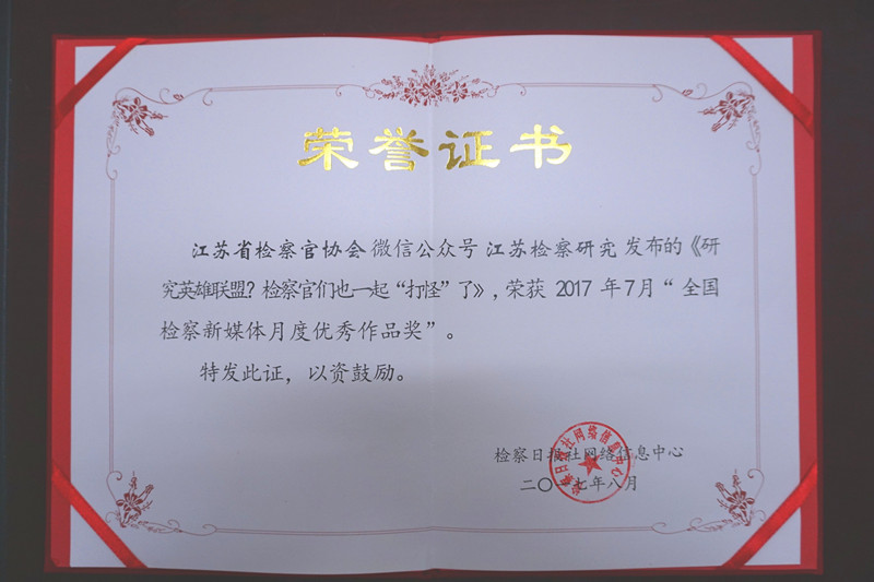 近日,在检察日报社网络信息中心开展的全国检察新媒体作品评选中,我省检察官协会微信公众号“丝袜小说 研究”发布的《英雄联盟?检察官们也一起来‘打怪’了》,荣获“全国检察新媒体月度优秀作品奖”。