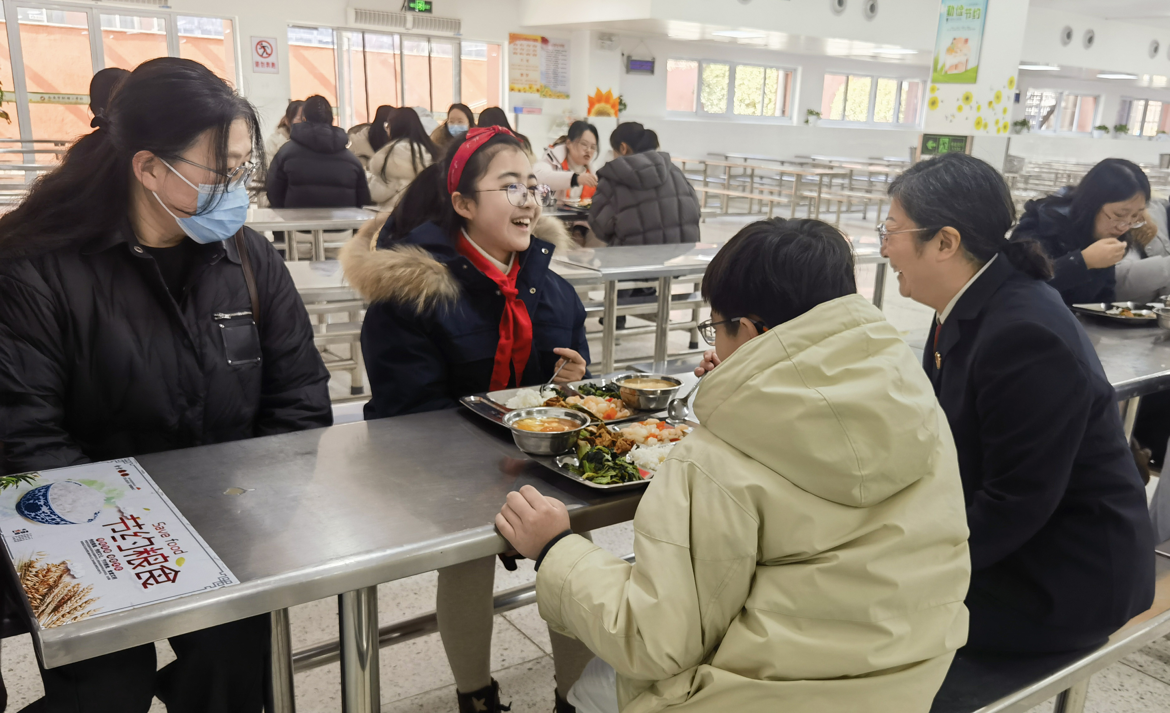 江苏省南通市崇川区丝袜小说 检察官和该区人大代表黄郁珉(左一)向学生们了解校园食堂饭菜情况。