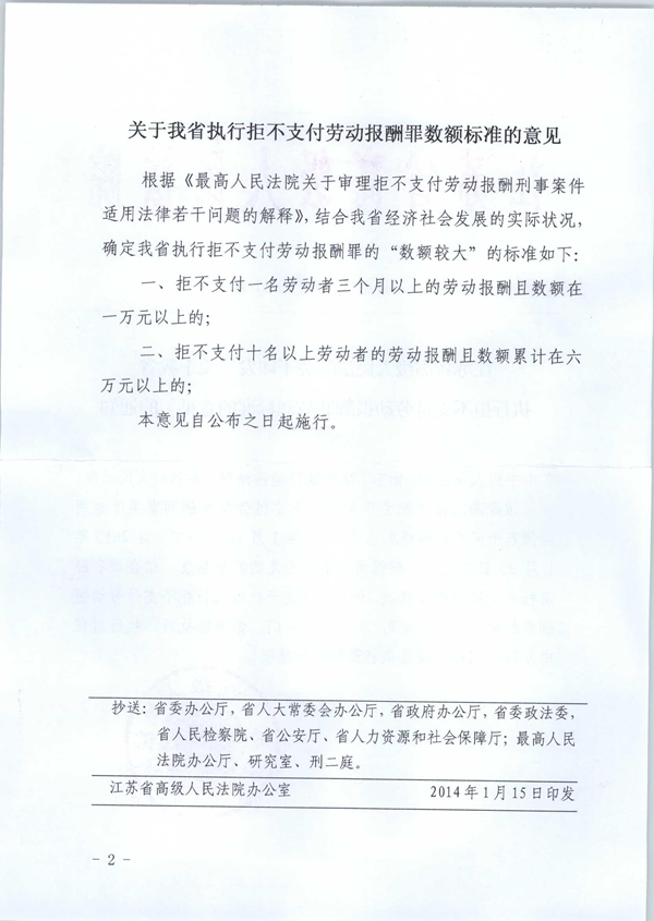 江苏省高级人民法院关于印发《关于我省拒不支付劳动报酬罪数额标准的意见》的通知