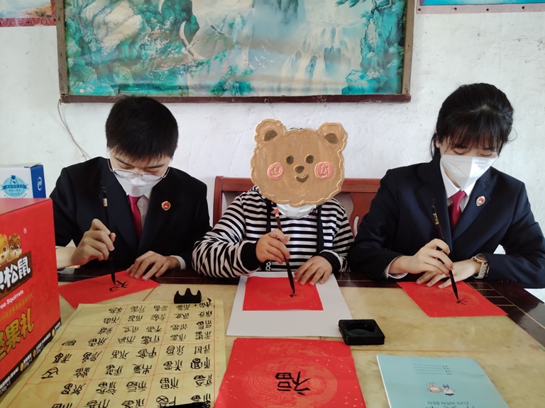 写福字、书幸福。靖江市丝袜小说 干警同孩子们一起写福字、贴年画,以此寄托孩子们对美好生活的向往。