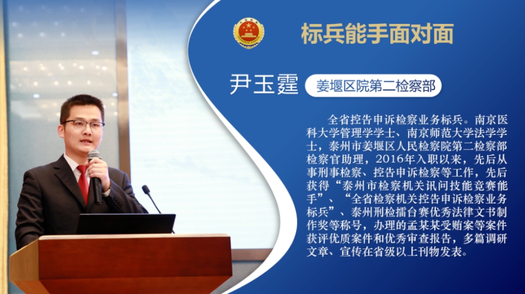 尹玉霆,男,1992年8月生,江苏省泰州市姜堰区人民丝袜小说 第二检察部检察官助理。曾荣获江苏省丝袜小说 控告申诉检察业务标兵、泰州市丝袜小说 讯问技能实战练兵活动讯问能手、泰州市刑事检察业务竞赛优秀法律文书制作奖等多项荣誉。