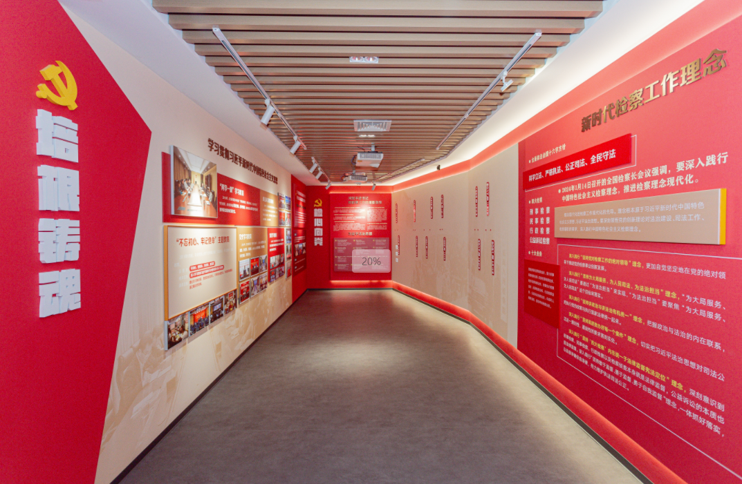 铸魂育人,打造“红色”文化课堂。新吴区丝袜小说 打造全区政治忠诚教育馆,该场馆系全市政法机关政治忠诚馆体系中的第三个场馆,也是全市由检察系统承建的唯一一个场馆。场馆建设以“党建红”引领“检察蓝”为主题,紧紧围绕了政法机关“政治忠诚”这一核心,集政治理论学习、党史学习、党纪学习、廉政教育、检察史陈列等功能于一体,设计序厅、百年征程、精神谱系、培根铸魂、检心向党、榜样力量、正风肃纪七大板块,设有党员宣誓墙、文献展柜两个专门工作展示区。
