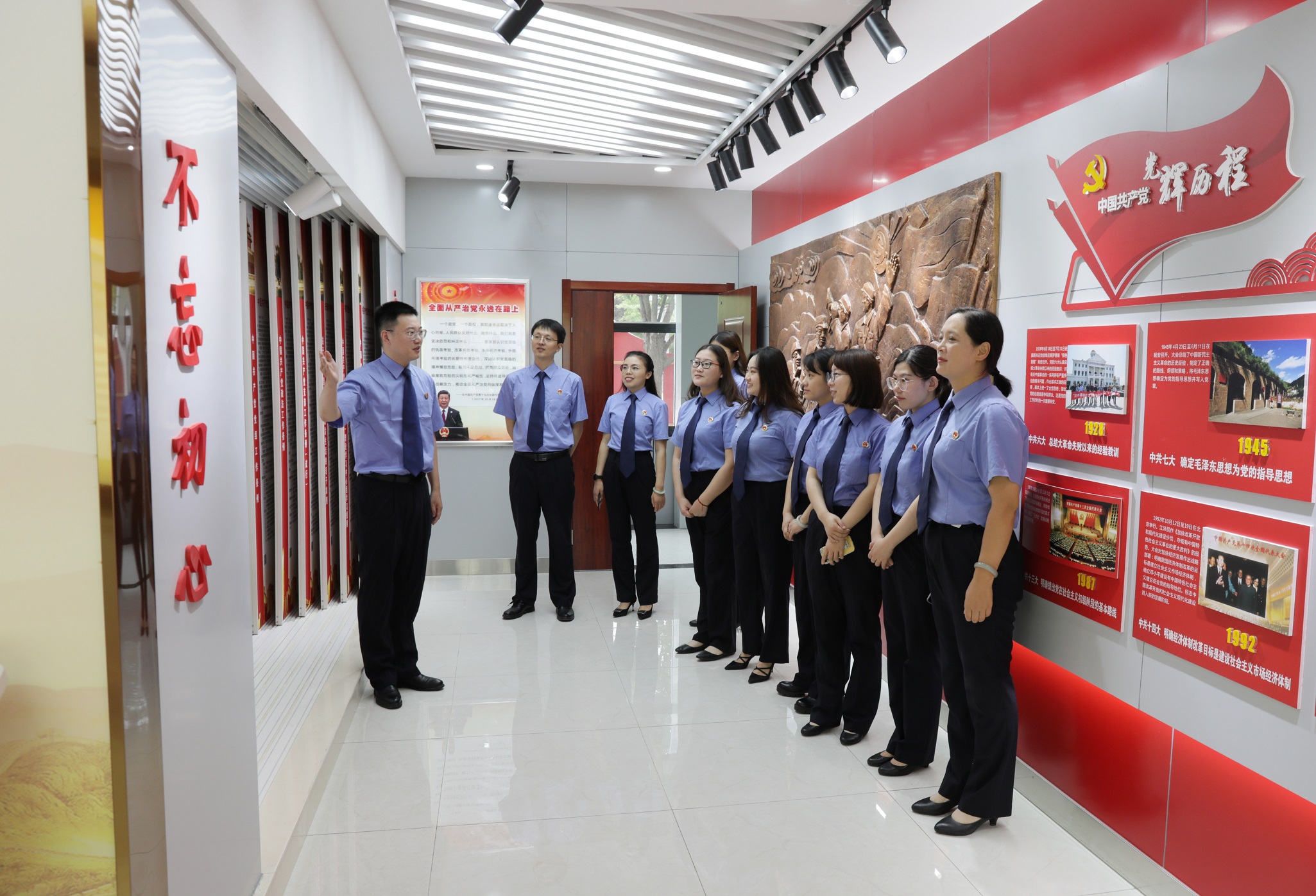 提升思想引领力,铸检察文化之“魂”。我院紧扣新时代检察文化建设要求,高标准建成400余平方米法治思想宣传教育基地。核心区域系统展示习近平法治思想精髓、中国共产党人精神谱系,配备互动学习屏、经典著作阅览区供干警使用。不仅成为大家每周政治理论学习、主题党日活动、“陇海清风学习社”青年理论小组研讨的固定场所,更是新录用公务员入职“第一课”、职务职级晋升及党性教育的“加油站”,全院干警政治判断力、政治领悟力、政治执行力显著增强,为“高质效办好每一个案件”奠定坚实思想根基。区域还设置“海纳英才、智创未来”先进典型展示区,系统展示近3年在全省检察业务竞赛中斩获佳绩的8名标兵、能手的座右铭及成长历程,依托该阵地举办“清风朐来 大道至检”读书交流会、竞赛经验分享会、援疆干部讲述会等活动,引导瞄准标杆汲取智慧,碰撞交流促进精进,持续放大先进典型示范引领作用。该基地还运用声光电技术和真实案例剖析,打造沉浸式警示教育空间,常态化开展廉政党课、党规党纪“小课堂”等活动,邀请干警及家属共同参加,共筑家庭廉洁防线。