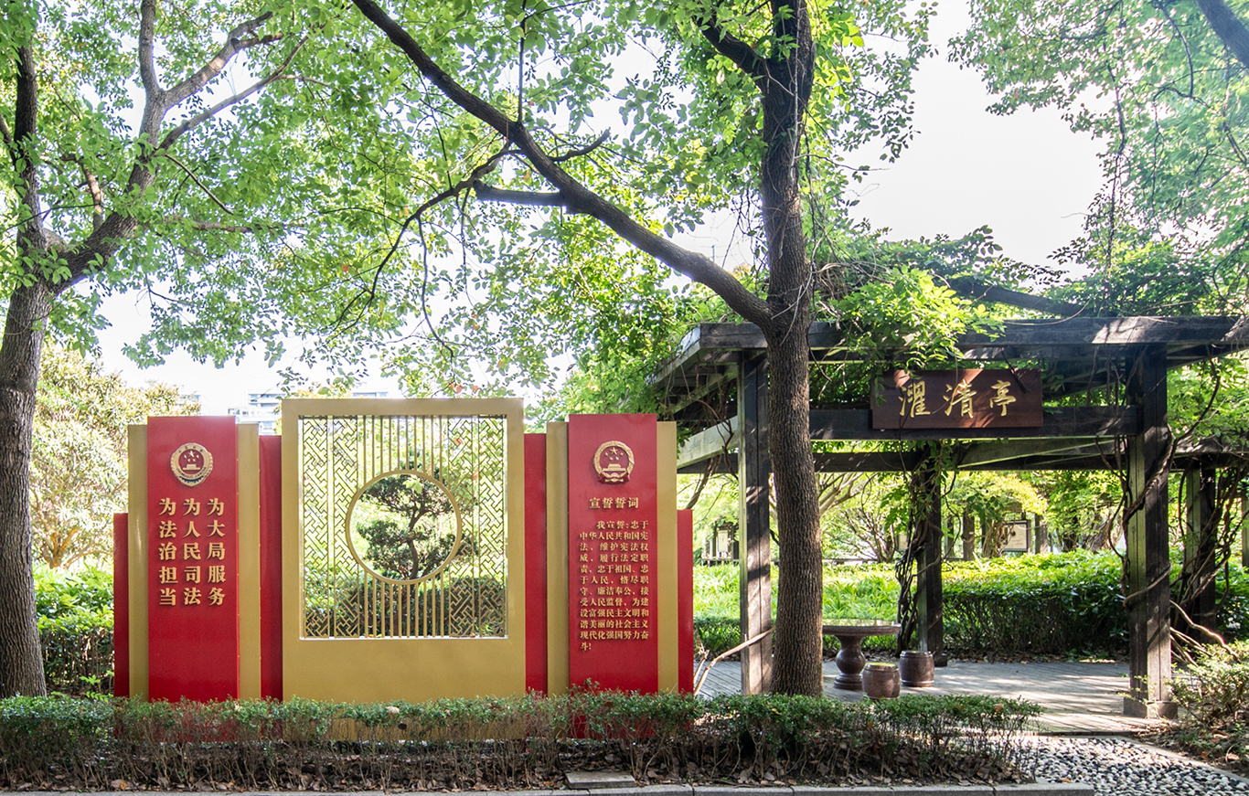“清风园”:润物无声绘就廉洁皋检。作为“江苏省园林单位”,我院在主楼北侧建有“清风园”,以园内一棵青枫树命名,寓意“清风正气”。“清风园”南侧建有“濯清亭”,旁立一面宪法宣誓墙,西南角树一“清风石”,另有一条九曲“廉桥”横跨一汪“廉池”,自南向北联通主楼与办案工作区,“廉桥”两旁悬挂干警廉洁格言。廉洁文化与园内绿化充分融合,助推干警在每日必经路上接受自然与人文交响的“廉洁课”。此外,我院结合“5·10”思廉日、廉政算账月等节点,组织“清廉说”“家属开放日”等教育活动,加大内部督查力度,督促干警植廉于心、清风同行。