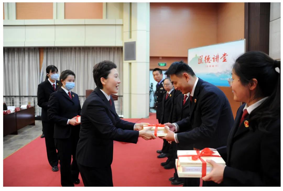 党史、新中国史、改革开放史、社会主义发展史,镌刻着我们党的拼搏奋斗历程。四名干警走上讲台,讲述“四史”故事,带领大家重温奋斗岁月,让历史照进现实,引导干警学史明理、学史增信、学史崇德、学史力行。为进一步推动党员干警向历史寻经验、求规律、探未来,院党组书记、检察长王骅还为支部党员代表赠送四史学习教育书籍。