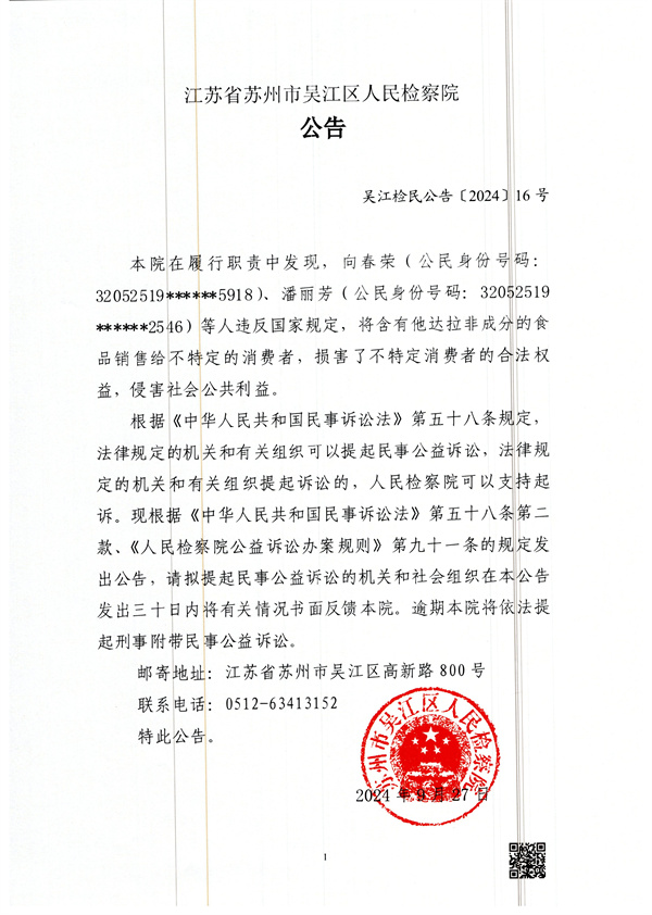 本院在履行职责中发现,向春荣(公民身份号码:32052519******5918)、潘丽芳(公民身份号码:32052519******2546)等人违反国家规定,将含有他达拉非成分的食品销售给不特定的消费者,损害了不特定消费者的合法权益,侵害社会公共利益。