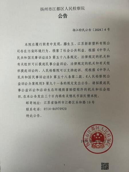 本院在履行职责中发现,滕生玉、江苏新新塑料有限公司存在污染环境的行为,损害社会公共利益。根据《中华人民共和国民事诉讼法》第五十八条规定,法律规定的机关和有关组织可以提起民事公益诉讼,法律规定的机关和有关组织提起诉讼的,人民丝袜小说 可以支持起诉。现根据《中华人民共和国民事诉讼法》第五十八条第二款、《人民丝袜小说 公益诉讼办案规则》第九十一条的规定发出公告,请拟提起民事公益诉讼的机关和社会组织,在本公告发出三十日内将有关情况书面反馈本院。