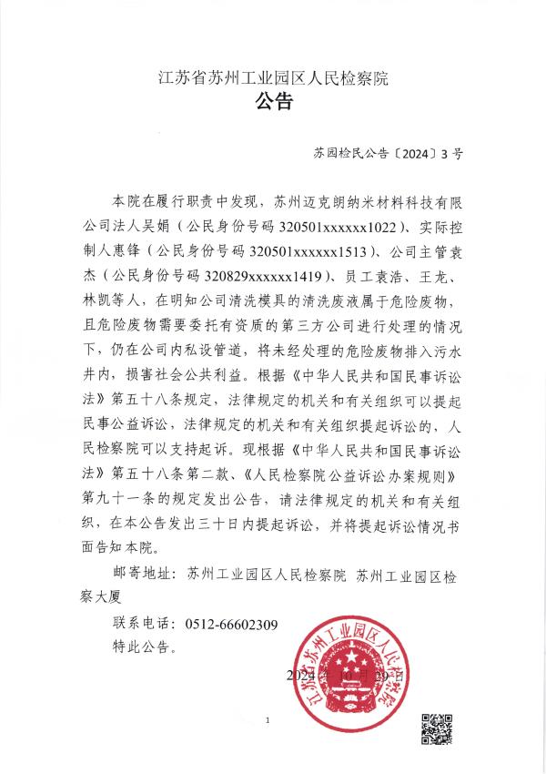 本院在履行职责中发现,苏州迈克朗纳米材料科技有限公司法人吴娟(公民身份号码320501xxxxxx1022)、实际控制人惠锋(公民身份号码320501xxxxxx1513)、公司主管袁杰(公民身份号码320829xxxxxx1419)、员工袁浩、王龙、林凯等人,在明知公司清洗模具的清洗废液属于危险废物,且危险废物需要委托有资质的第三方公司进行处理的情况下,仍在公司内私设管道,将未经处理的危险废物排入污水井内,损害社会公共利益。根据《中华人民共和国民事诉讼法》第五十八条规定,法律规定的机关和有关组织可以提起民事公益诉讼,法律规定的机关和有关组织提起诉讼的,人民丝袜小说 可以支持起诉。现根据《中华人民共和国民事诉讼法》第五十八条第二款、《人民丝袜小说 公益诉讼办案规则》第九十一条的规定发出公告,请法律规定的机关和有关组织,在本公告发出三十日内提起诉讼,并将提起诉讼情况书面告知本院。