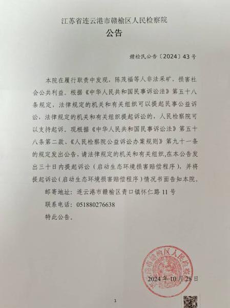 本院在履行职责中发现,陈茂福等人非法采矿,损害社会公共利益。根据《中华人民共和国民事诉讼法》第五十八条规定,法律规定的机关和有关组织可以提起民事公益诉讼,法律规定的机关和有关组织提起诉讼的,人民丝袜小说 可以支持起诉。现根据《中华人民共和国民事诉讼法》第五十八条第二款、《人民丝袜小说 公益诉讼办案规则》第九十一条的规定发出公告,请法律规定的机关和有关组织,在本公告发出三十日内提起诉讼(启动生态环境损害赔偿程序),并将提起诉讼(启动生态环境损害赔偿程序)情况书面告知本院。