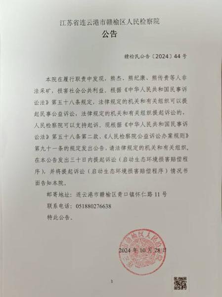 本院在履行职责中发现,熊杰、熊纪康、熊传贵等人非法采矿,损害社会公共利益。根据《中华人民共和国民事诉讼法》第五十八条规定,法律规定的机关和有关组织可以提起民事公益诉讼,法律规定的机关和有关组织提起诉讼的,人民丝袜小说 可以支持起诉。现根据《中华人民共和国民事诉讼法》第五十八条第二款、《人民丝袜小说 公益诉讼办案规则》第九十一条的规定发出公告,请法律规定的机关和有关组织,在本公告发出三十日内提起诉讼(启动生态环境损害赔偿程序),并将提起诉讼(启动生态环境损害赔偿程序)情况书面告知本院。
