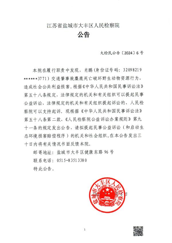 本院在履行职责中发现,肖鹏(身份证号码:32098219******3771)交通肇事致麋鹿死亡破坏野生动物资源行为,造成社会公共利益损害。根据《中华人民共和国民事诉讼法》第五十八条规定,法律规定的机关和有关组织可以提起民事公益诉讼,法律规定的机关和有关组织提起诉讼的,人民丝袜小说 可以支持起诉。现根据《中华人民共和国民事诉讼法》第五十八条第二款、《人民丝袜小说 公益诉讼办案规则》第九十一条的规定发出公告,请拟提起民事公益诉讼(和启动生态环境损害赔偿程序)的机关和社会组织,在本公告发出三十日内将有关情况书面反馈本院。
