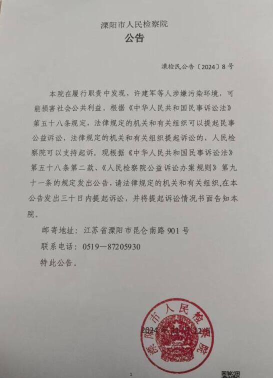 本院在履行职责中发现,许建军等人涉嫌污染环境,可能损害社会公共利益。根据《中华人民共和国民事诉讼法》第五十八条规定,法律规定的机关和有关组织可以提起民事公益诉讼,法律规定的机关和有关组织提起诉讼的,人民丝袜小说 可以支持起诉。现根据《中华人民共和国民事诉讼法》第五十八条第二款、《人民丝袜小说 公益诉讼办案规则》第九十一条的规定发出公告,请法律规定的机关和有关组织,在本公告发出三十日内提起诉讼,并将提起诉讼情况书面告知本院。