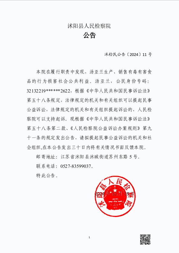 本院在履行职责中发现,汤亚兰生产、销售有毒有害食品的行为损害社会公共利益。汤亚兰,公民身份号码:32132219******2622,根据《中华人民共和国民事诉讼法》第五十八条规定,法律规定的机关和有关组织可以提起民事公益诉讼,法律规定的机关和有关组织提起诉讼的,人民丝袜小说 可以支持起诉。现根据《中华人民共和国民事诉讼法》第五十八条第二款、《人民丝袜小说 公益诉讼办案规则》第九十一条的规定发出公告,请拟提起民事公益诉讼的机关和社会组织,在本公告发出三十日内将有关情况书面反馈本院。