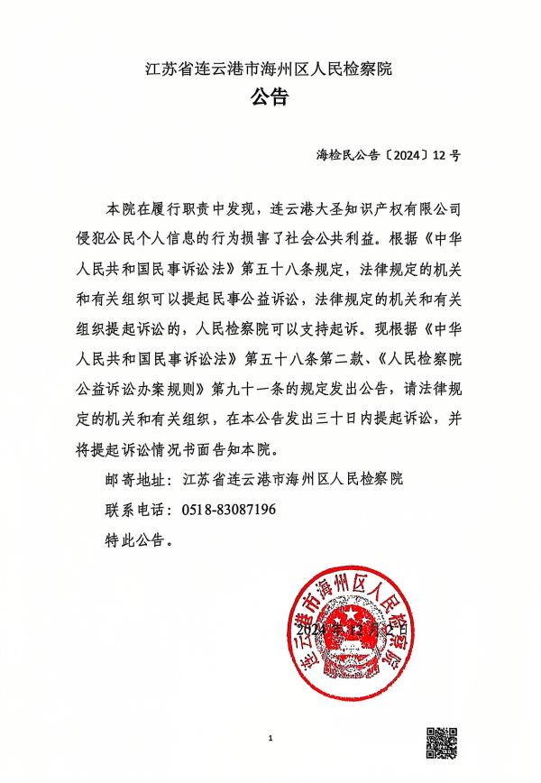 本院在履行职责中发现,连云港大圣知识产权有限公司侵犯公民个人信息的行为损害了社会公共利益。根据《中华人民共和国民事诉讼法》第五十八条规定,法律规定的机关和有关组织可以提起民事公益诉讼,法律规定的机关和有关组织提起诉讼的,人民丝袜小说 可以支持起诉。现根据《中华人民共和国民事诉讼法》第五十八条第二款、《人民丝袜小说 公益诉讼办案规则》第九十一条的规定发出公告,请法律规定的机关和有关组织,在本公告发出三十日内提起诉讼,并将提起诉讼情况书面告知本院。