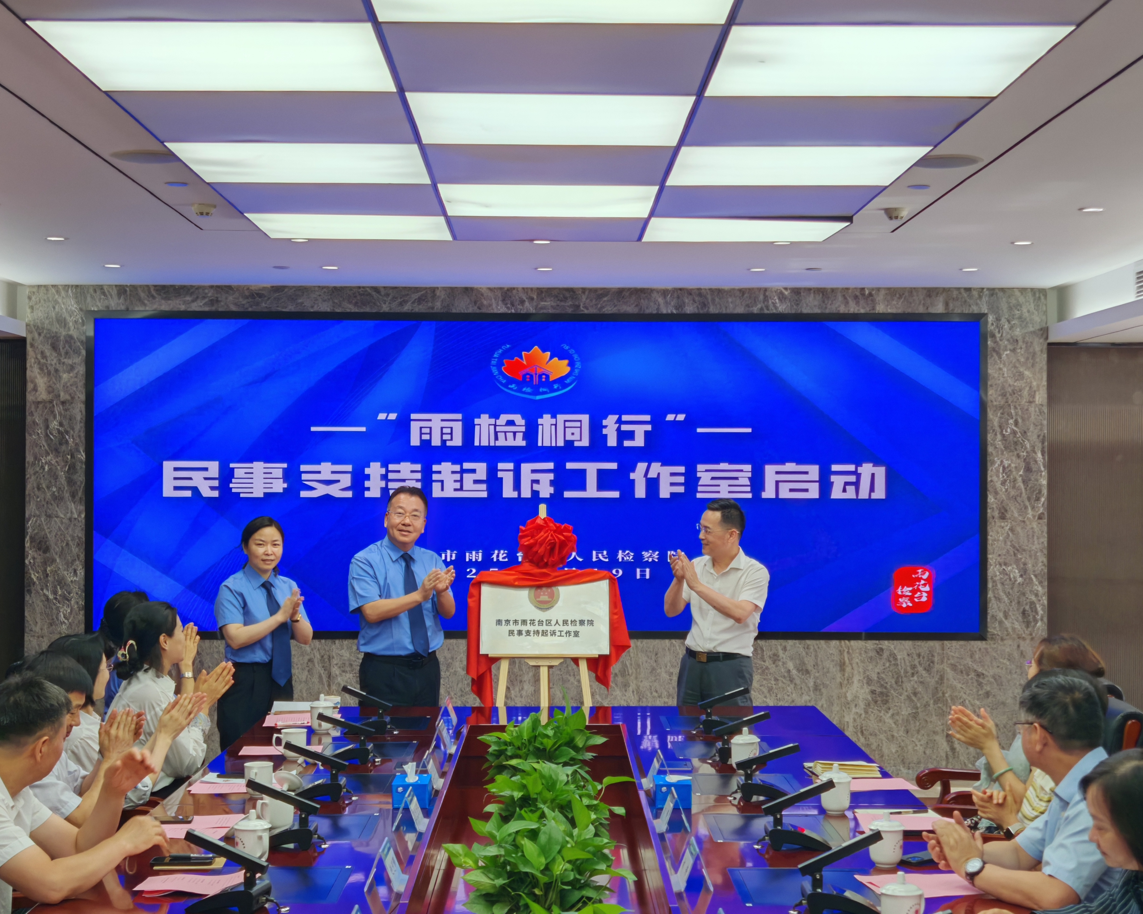 5月19日下午,江苏省丝袜小说 、南京市丝袜小说 、雨花台区丝袜小说 联合举办以“‘典’亮生活,守护美好”为主题的民法典颁布五周年检察开放日暨“雨检桐行”民事支持起诉工作室启动仪式。图为南京市丝袜小说 党组成员、副检察长王珍祥和雨花台区委副书记王金玉共同为工作室揭牌。